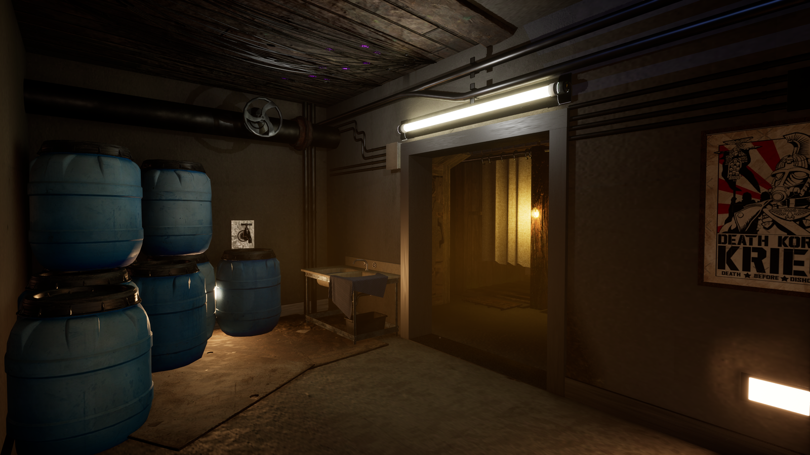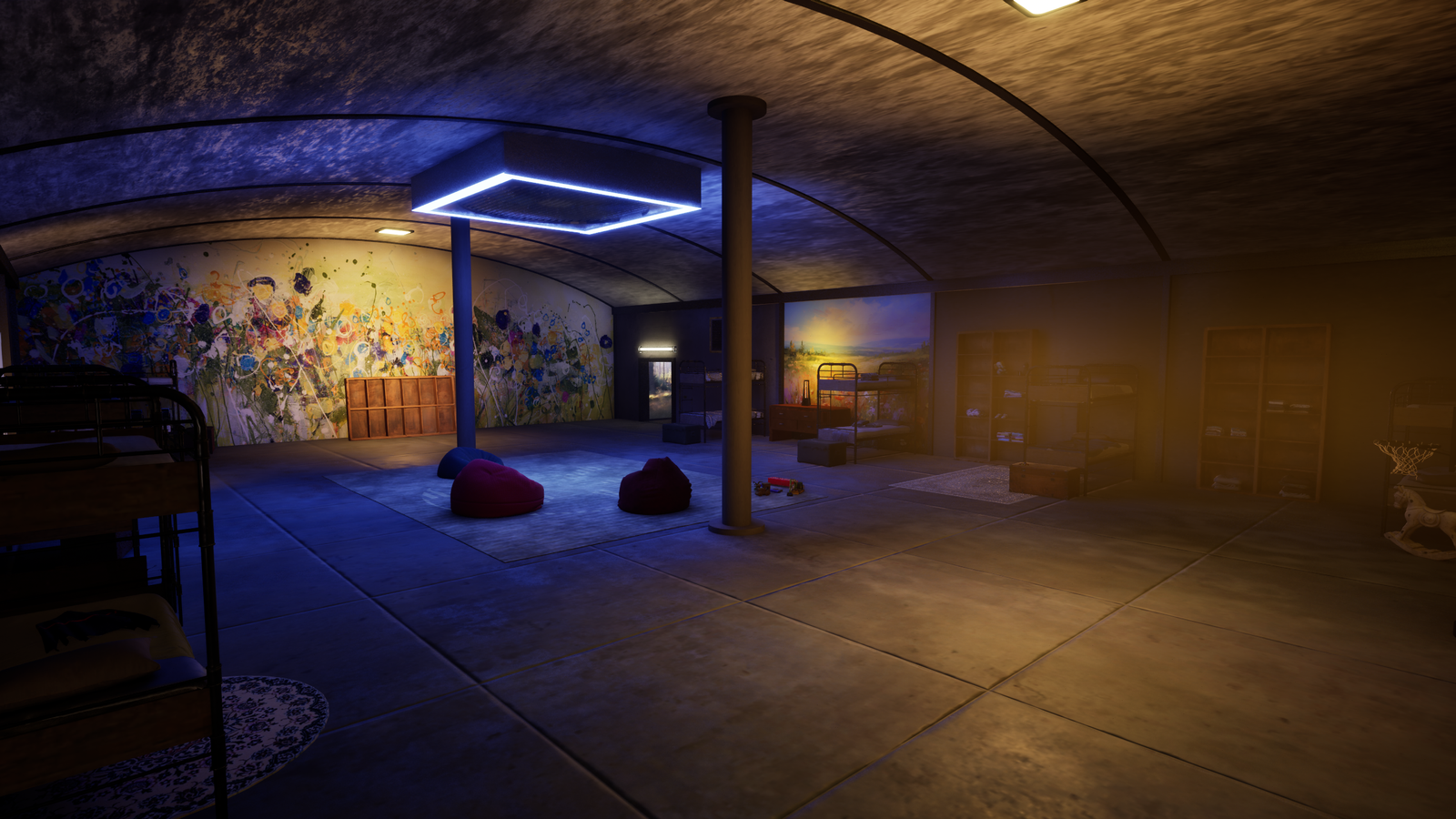 There were many lessons to be learned in the process, primarily regarding lightning, environmental effects, media players for live video, and particularly around using decals to enhance the realism of a scene. A floor slick from the mud of many footsteps tracking through the room feels more visceral than a clean one with no signs of traffic.